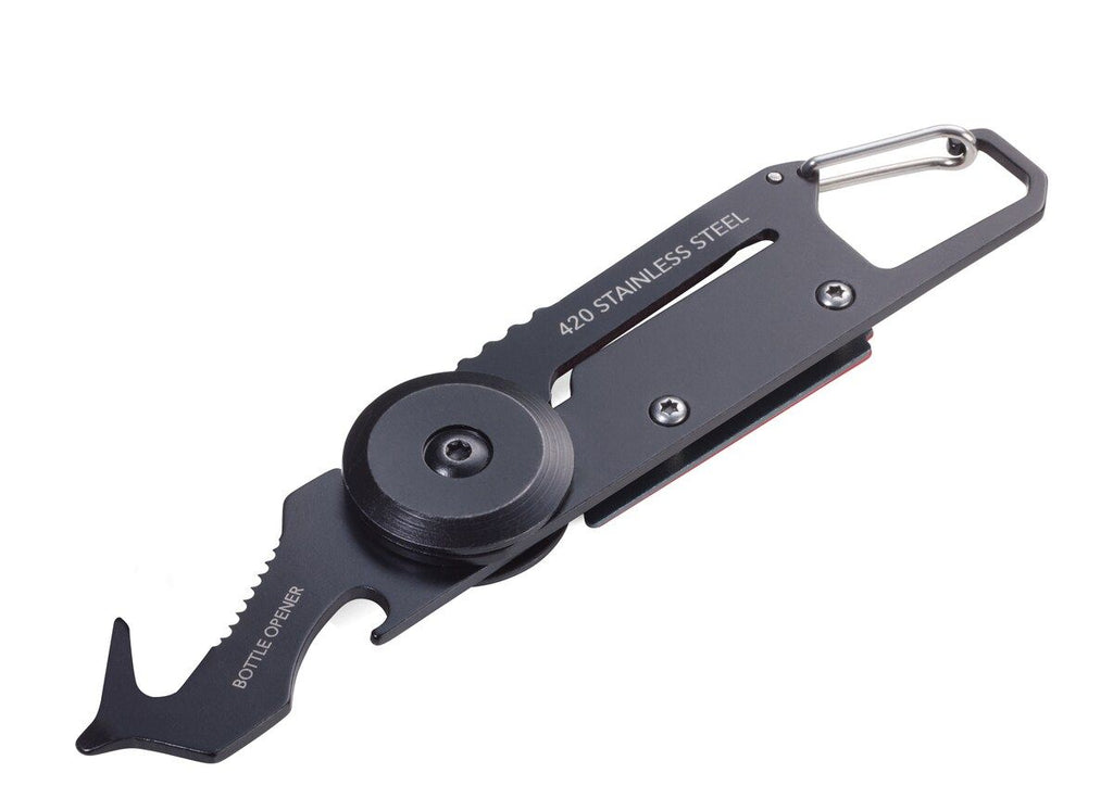Mini tool with 5 functions, parcel cutter, carabiner, small saw blade, slotted screwdriver, bottle opener, 420 stainless steel / aluminium